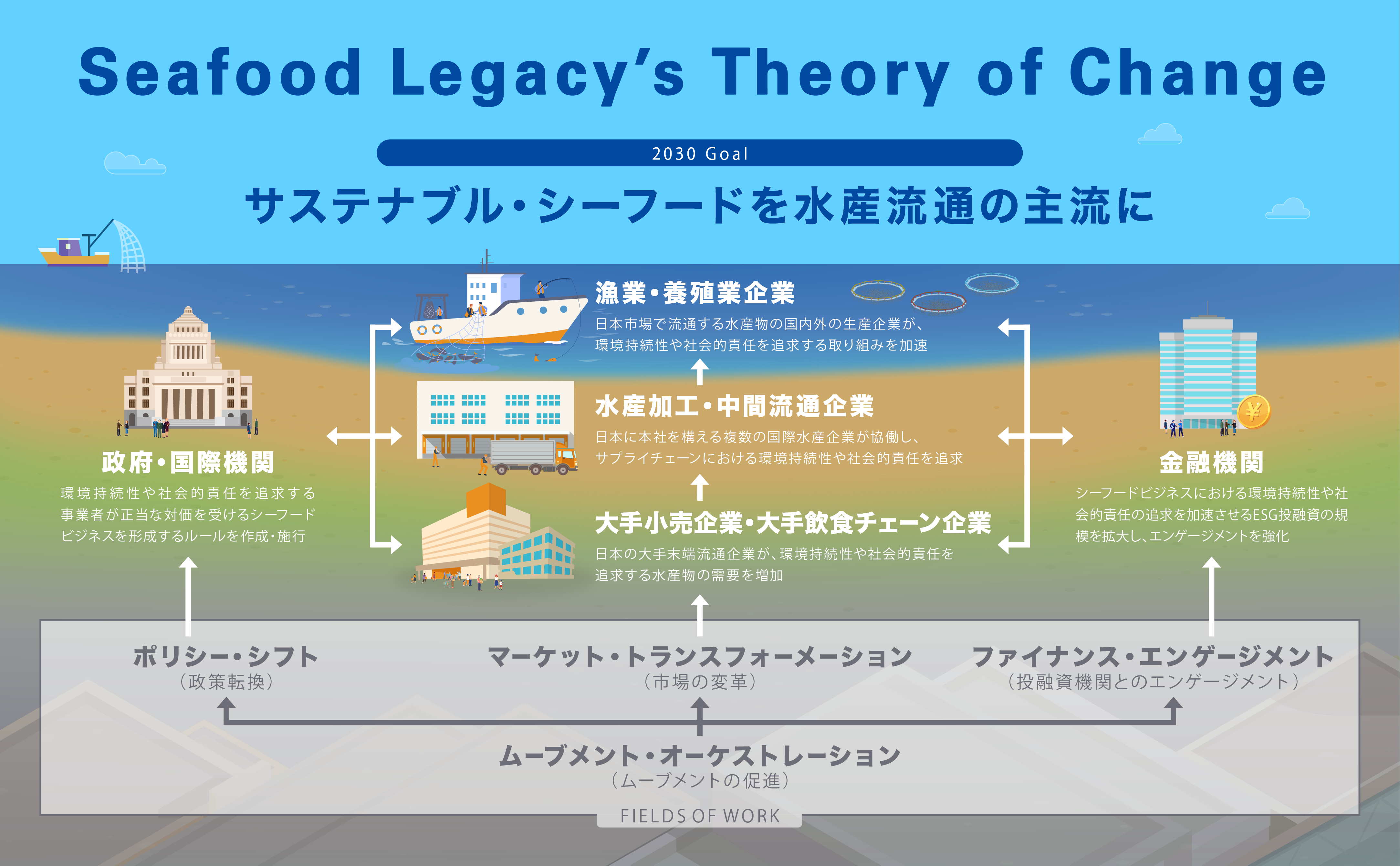 国内の大手末端流通企業によるサステナブル&レスポンシブル・シーフードの需要が増えることで、日本に本社を構える複数の国際水産企業が協働し、国内外のサプライチェーンにおける環境持続性や社会的責任を追求する体制が整ってゆく – この実現への伴奏が、シーフードレガシーの1つ目の事業領域「マーケット・トランスフォーメーション」です。